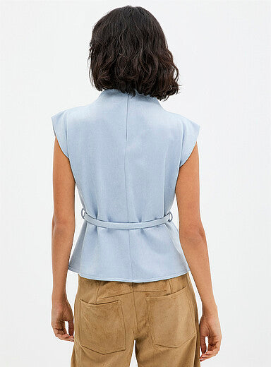 Elevate your everyday look with this elegant belted faux-suede blouse. Crafted from soft, stretchy faux-suede fabric, it features a modern boxy silhouette, a subtle draped mock neck, and pleated cap sleeves for a touch of sophistication. The adjustable belt beautifully defines your waist, while the hidden back zipper ensures a smooth finish.