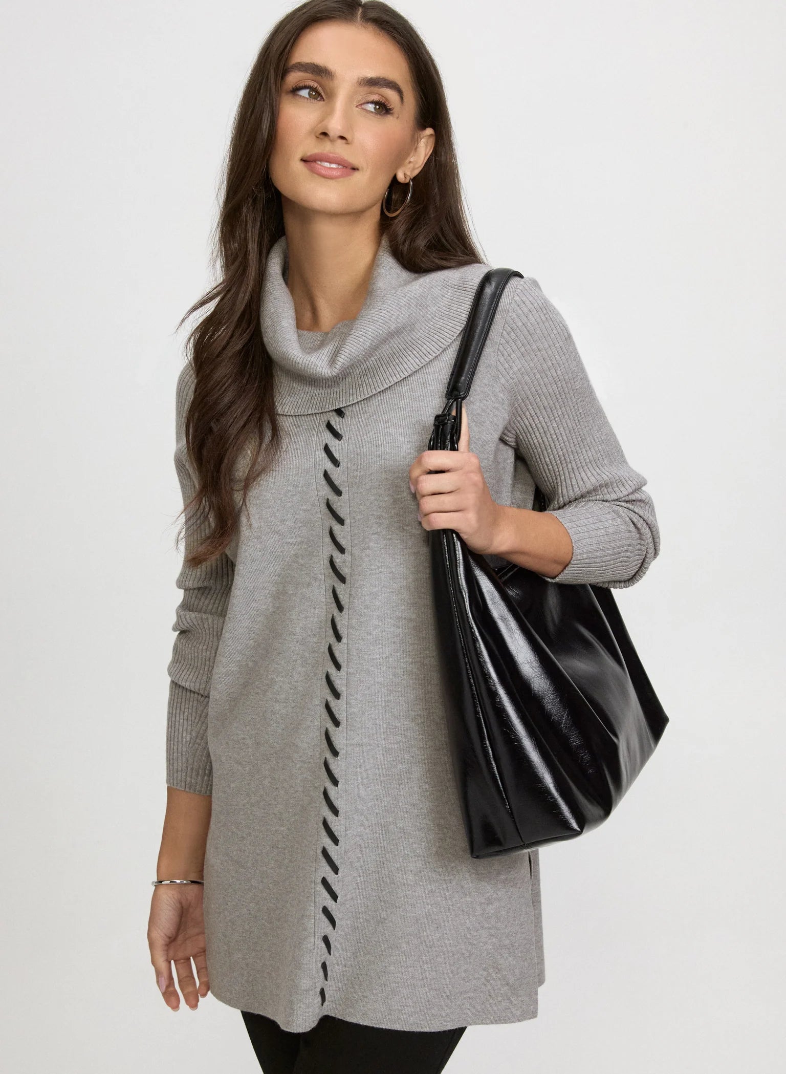 Elevate your cool-weather wardrobe with the Contrast Cowl Neck Sweater, designed for effortless sophistication and comfort. The bold vertical saddle stitch detail creates a modern statement, while the soft cowl neck and tunic length offer a flattering, relaxed silhouette. Perfect for pairing with fitted black pants or sleek leggings for a polished, contemporary look.